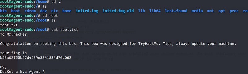 Finally, we also read the “root.txt” file, and there you have it! We also discover that the “DesKel” user is the same as Agent R!