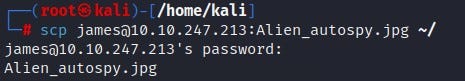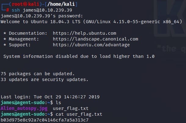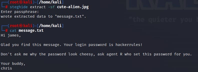 In the image’s message, we find “james” agent’s password. Let’s enter the system as the “james” user via an SSH connection.