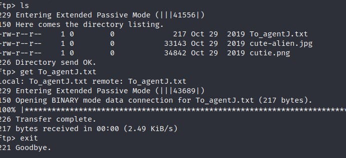 Hmm… Here, we see that there is a message from Agent C to Agent J. It mentions that Agent J’s password can be found in one of the pictures. Let’s retrieve the images from FTP.