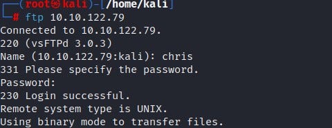 We obtain the FTP password for Chris. Let’s establish FTP connection.