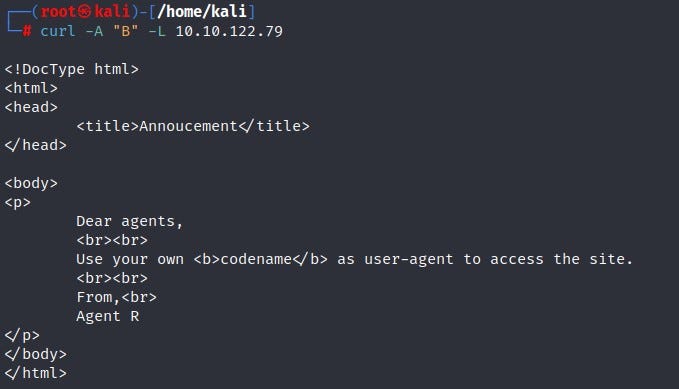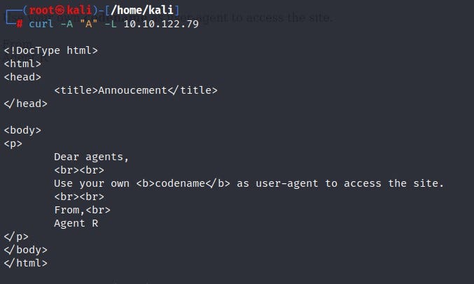 We can further inspect the website using the “burpsuite” tool or the “curl” command. I chose to use the curl command. The curl command is a command used for various purposes, such as checking URLs and transferring data on web pages. Let’s look at the URL information sent by the person named “Agent R.”