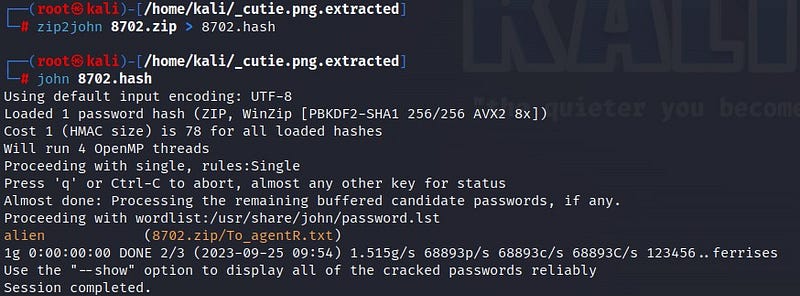 First, we need to convert the zip file into a format that “john” can use. We can use “zip2john” for this purpose. Then, when we crack the password with “john,” we obtain the information that it is “alien.”