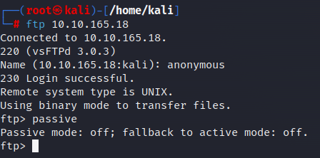 We do not find any useful information on the web page. Let’s connect to the FTP port based on the nmap results. After establishing the connection, don’t forget to switch to active mode by typing “passive.”
