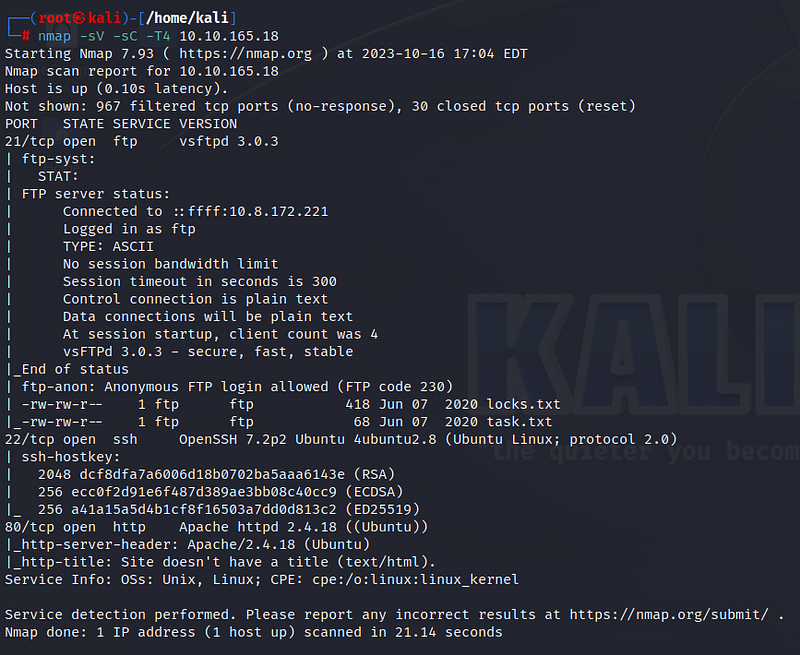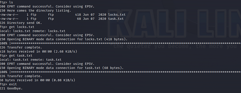 We come across two files named “locks.txt” and “task.txt.” Let’s download these files to our system using the “get” command and then terminate the FTP connection.