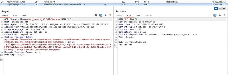 On the vault screen, when we click the “Export” button, we can see that it downloads a file with a filename generated specifically for us. When we inspect the requests in Burp, we notice that the download is performed via a GET request.