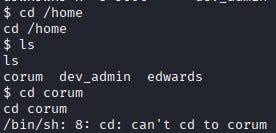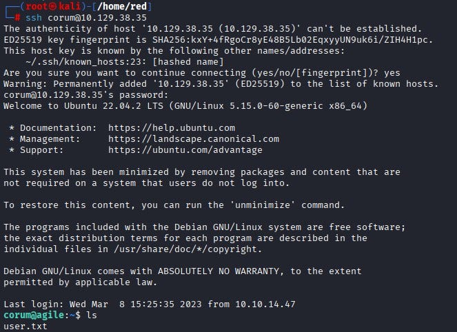 We SSH into the machine as corum. We can find the user flag under corum’s home directory.