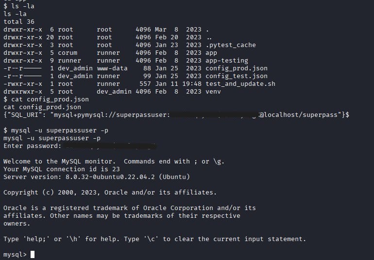 After digging a bit more, we find a file named config_prod.json under the /app directory. This file contains MySQL database connection details. Using these details, we connect to the MySQL database.