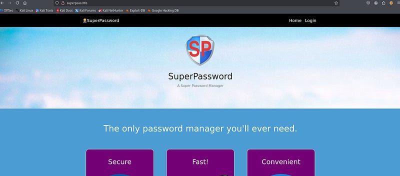 To access the website, we add the IP address to our /etc/hosts file. When we open the website, we reach a Password Manager web page.