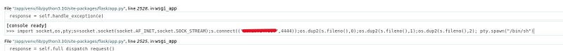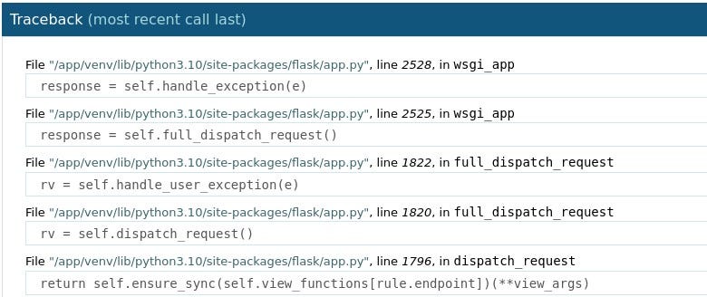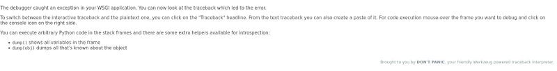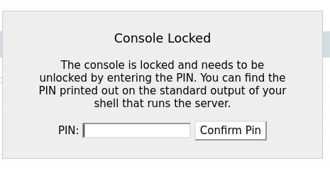 At the bottom of the error page, we can see that this is a Flask Werkzeug debugging page. With this debugging page, it is possible to access a console directly from the page. However, as in newer versions of Werkzeug, a PIN is required to access the console.