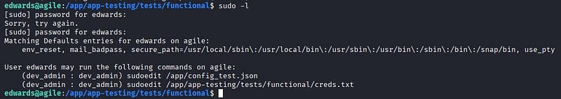 By running sudo -l, we can see what edwards is allowed to do with sudo. According to the output, edwards can run sudoedit as the user dev_admin to edit two different files.