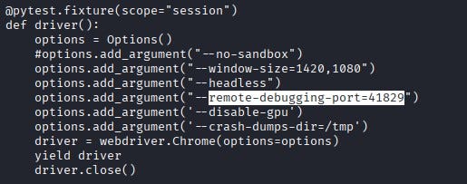 In Selenium setups, when Chrome runs for testing, it typically exposes a debugging port. From the code, we learn that 41829 is used as the debugging port.