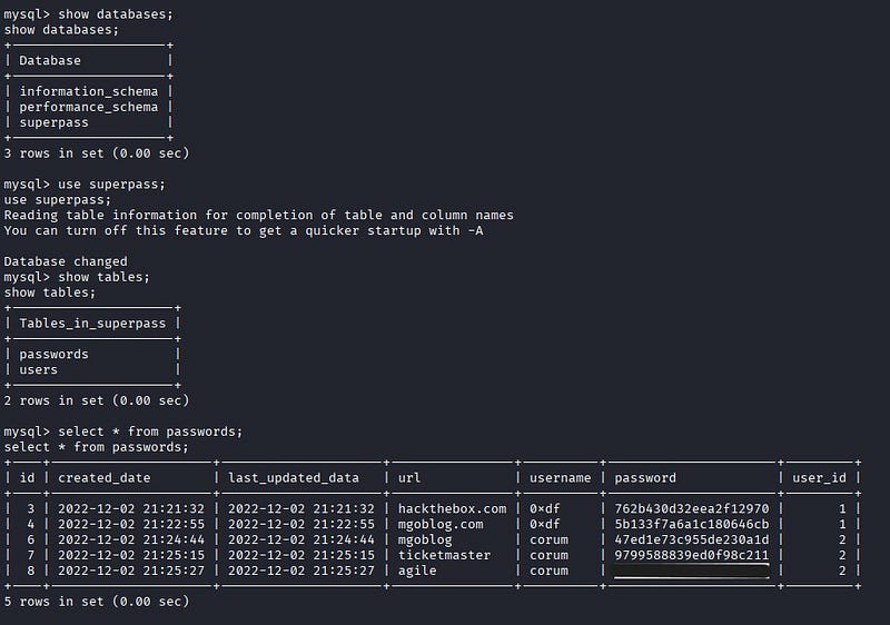 Inside MySQL, when we list the databases, we can connect to the database named superpass and view its tables. From the Passwords table, we retrieve the password for the user “corum”.