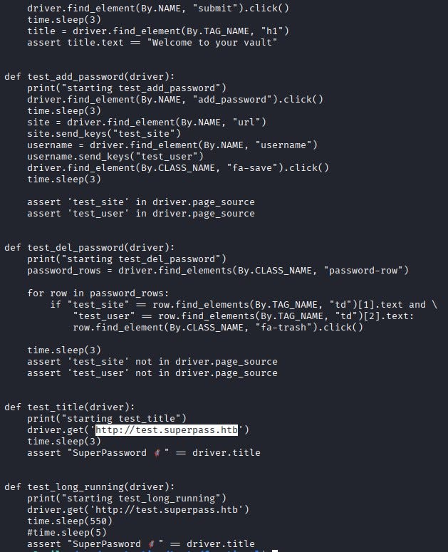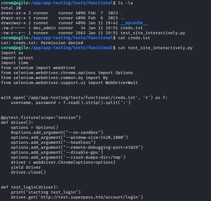 As the corum user, when we continue exploring the system, we notice a file named test_site_interactively.py under /app/app-testing/tests/functional. By reading the file, we see that it is used for testing the password manager website. The script reads credential information from creds.txt (which we cannot read directly), loads a Selenium web driver, and logs into the test version of the site.