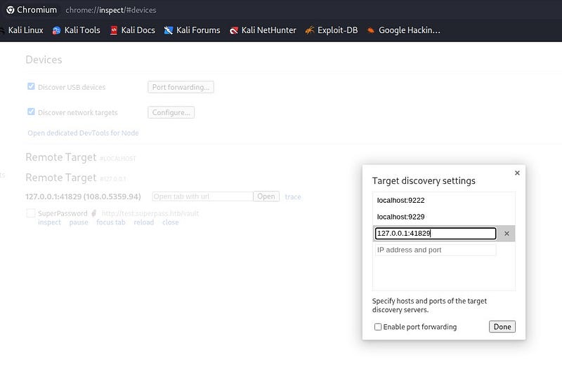 In Chrome, we go to chrome://inspect and add 127.0.0.1:41829 under Target discovery. When we click Inspect, we can see that it takes us to the test page.