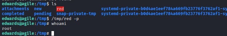 After a few minutes, we can see the file appear under /tmp. When we run it with the -p flag, we successfully escalate to the root user. Finally, we can retrieve the root flag from /root/root.txt.