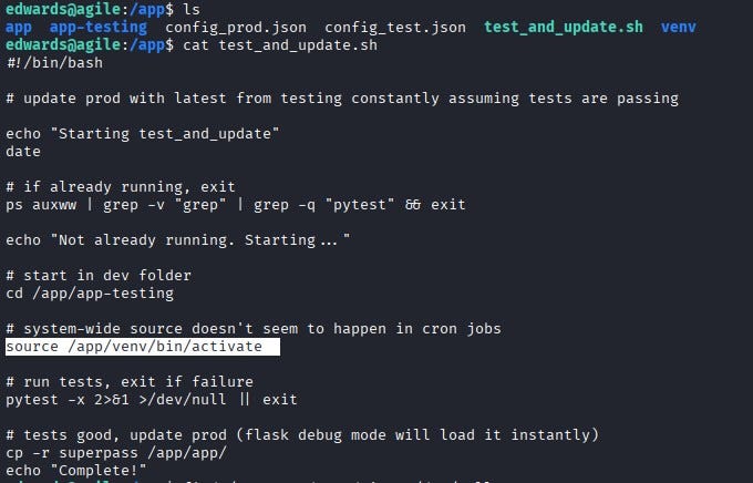 This is interesting because we can access a file named test_and_update.sh on the system. This file runs every minute with root privileges and executes the activate binary (/app/venv/bin/activate).