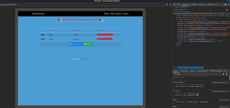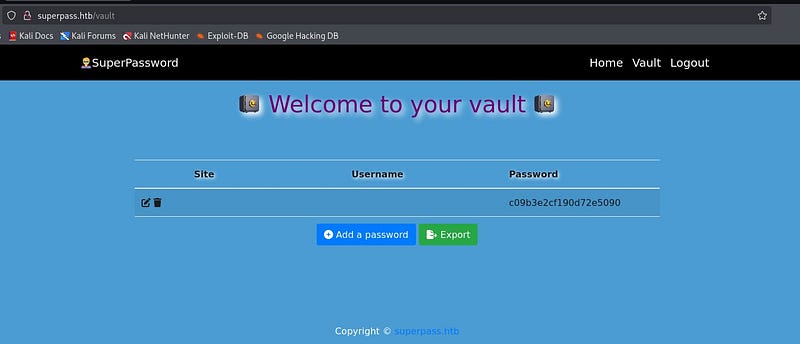 By registering with a random username, we can access the vault page and see that we can generate passwords for any site.