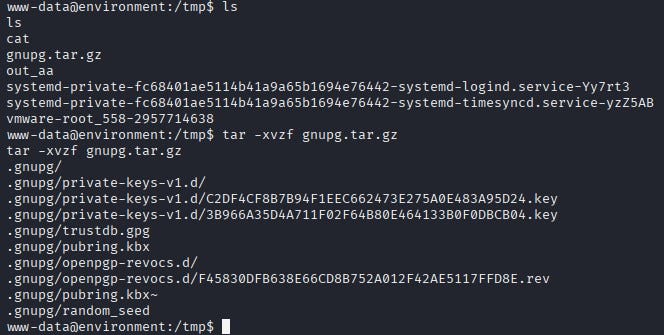 While exploring the system, a zipped file under /tmp caught attention. After unzipping, the files included keys that could be used to decrypt GPG-protected data.