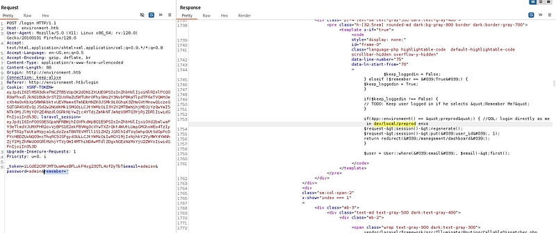In the response from Burp Suite, the phrase “Login directly as me in /dev/local/preprod envs” appeared. In this case, if the system is in the preprod environment (APP_ENV=preprod), login checks are bypassed and it logs directly in as the related user.