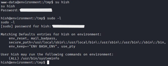 With the obtained password, a switch to user Hish was made. Using the “sudo -l” command, it was discovered which commands the user could run without a password or with elevated privileges. According to the output, the user could run the script “/usr/bin/systeminfo” with sudo privileges.