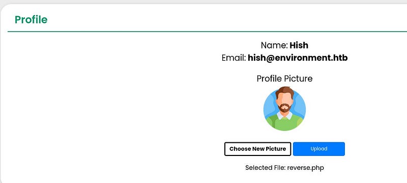 The page was accessed as user “Hish.” In the “Profile” section, it was seen that the user picture could be changed. It was thought that a malicious file could be uploaded here to get a shell.