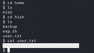 The user flag was obtained at “/home/hish/user.txt”.