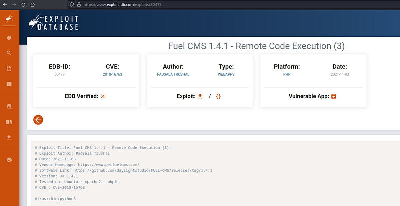 While navigating this page, we don’t find any useful information. Let’s recall that we found Fuel CMS version 1.4. Now, let’s investigate if there is any exploit available for this version.