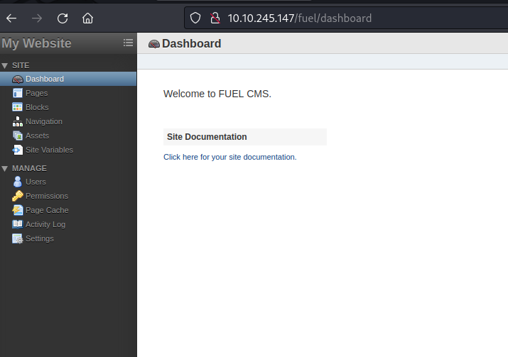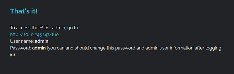 We find credentials for the given address. We had also found the “/fuel/” directory in the nmap scan results. Let’s navigate to the provided address.