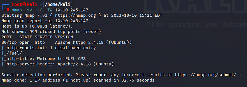 Based on the scan results, only one port is open: port 80, which is the HTTP port. Additionally, we observe the presence of a file named “robots.txt” and a “/fuel/” directory on the web page. Let’s start by visiting the web page.