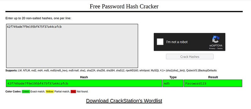 The “manager” name and the provided password are noteworthy. The password is likely a hashed expression. I obtain the password by cracking the hash value using Crackstation.