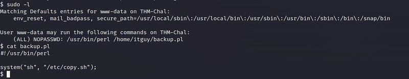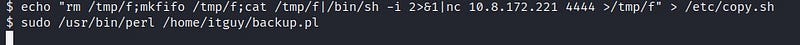 It seems we can run the backup.pl file with sudo privileges. When we look inside the file using the “cat” command, we can see that it runs the “/etc/copy.sh” file. Let’s check the content of this file.
