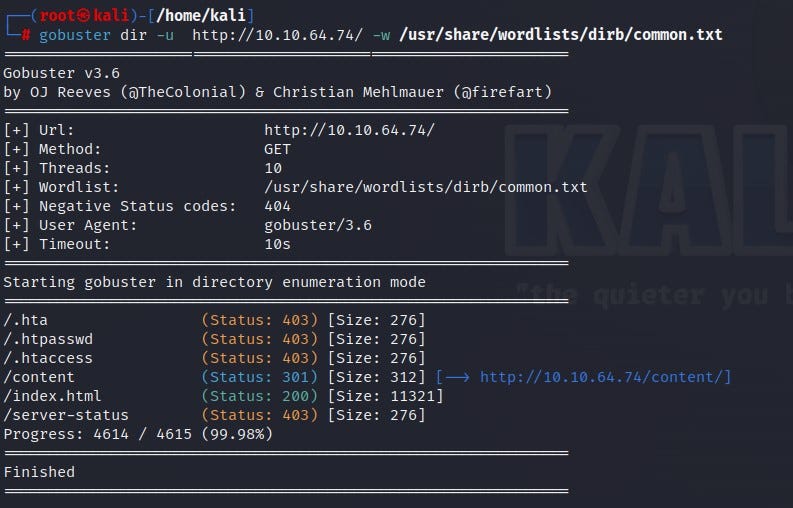 We see the default Ubuntu page. To find more information, let’s use the gobuster tool for further investigation.