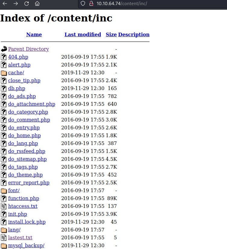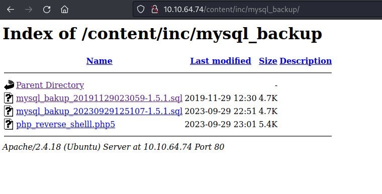 When I go to /content/inc/mysql_backup/ after uploading the file, I see that my reverse shell file is there.