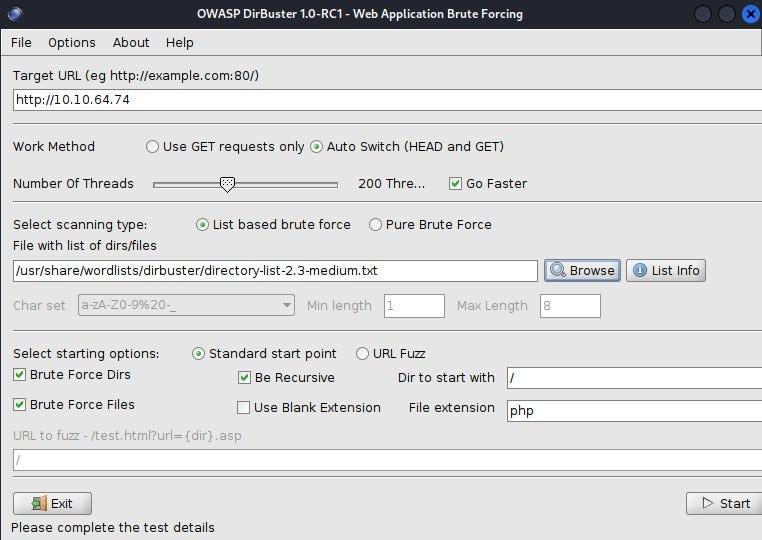 I accessed the dirbuster interface by typing the “dirbuster” command into my terminal.
