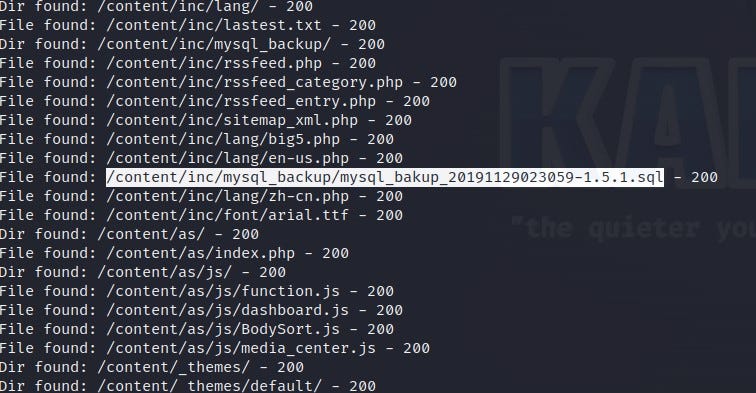 When examining the results, two phrases caught my eye: First, the mysql backup file under /content/inc content. We can find useful data from the database. Second, the /content/as content. Let’s investigate them one by one.