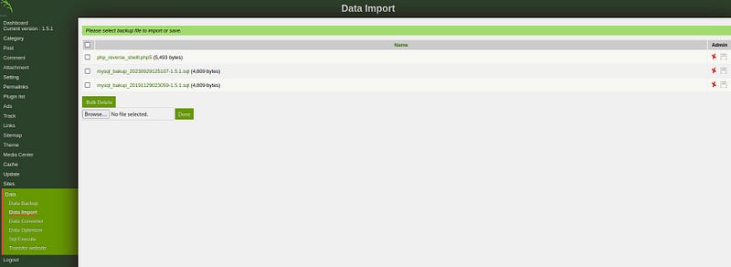 We notice places where we can upload files. The first thing that comes to mind is to infiltrate the system using a reverse shell. When we look at the “Data Import” section, we can see that we can upload a reverse shell here. I used the site in the link below for the reverse shell: