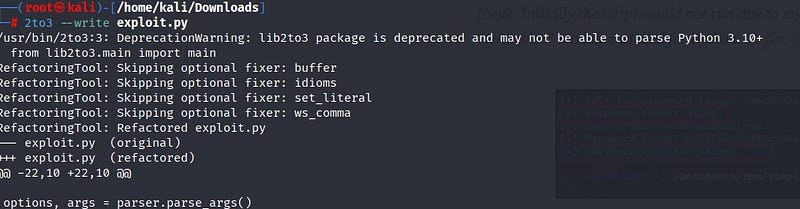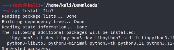 The exploit we found is written in Python 2. Since we are trying to run a Python 2 script in a Python 3 environment, we will encounter an error. To solve this, I used a tool called “2to3” to convert the Python 2 script to Python 3. I first install the tool and then perform the conversion.