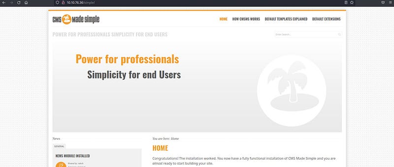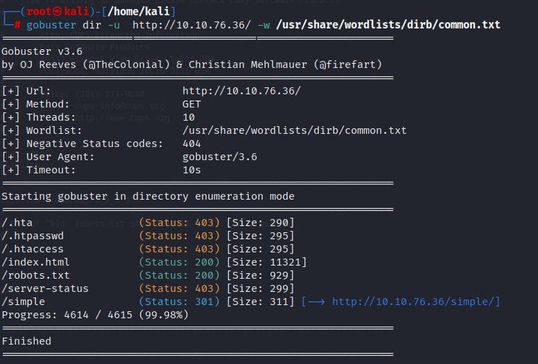 To check if there are any other directories on the web page, we can use gobuster. We find a directory named “/simple.”