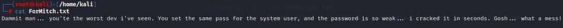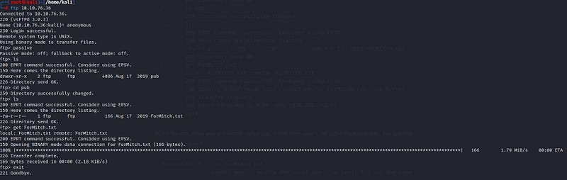 We connect anonymously to the ftp port and find a file named “ForMitch.txt” inside. Let’s retrieve the file to our system using the “get” command and take a look inside.